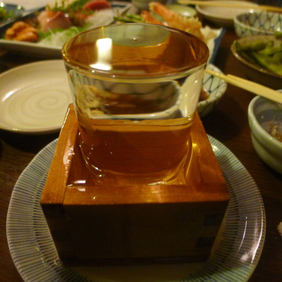 美味しい刺身と天ぷらで、もうこんななみなみの純米酒をがぶがぶ飲んでしまった。