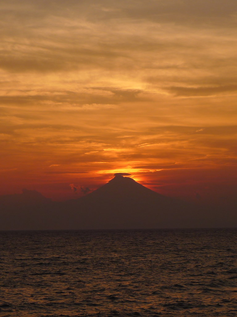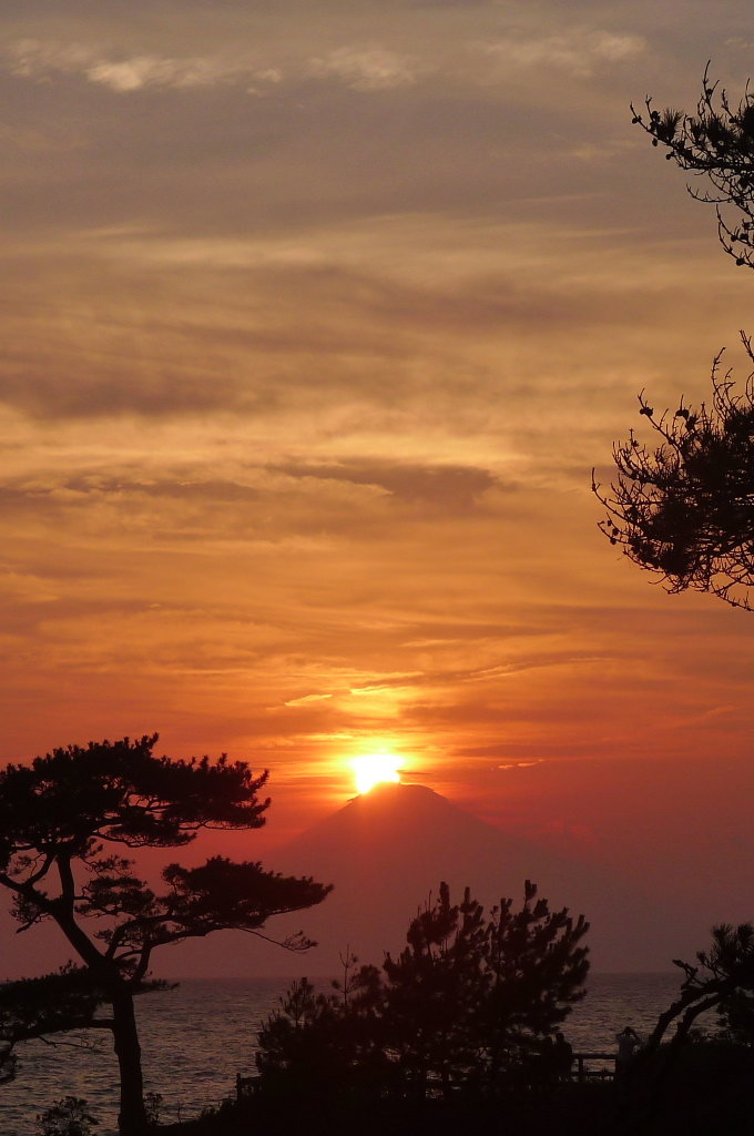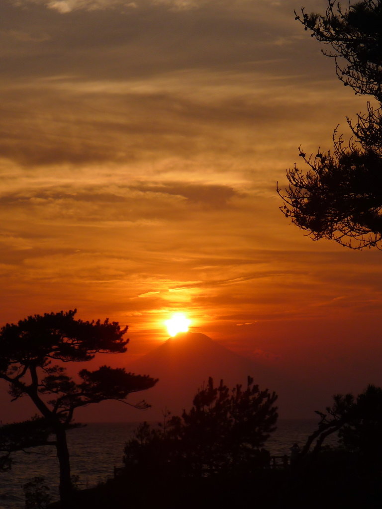 富士山の頂上に夕日が落ちるダイヤモンド富士です。真上じゃないけどなかなか見られない風景だと思います。