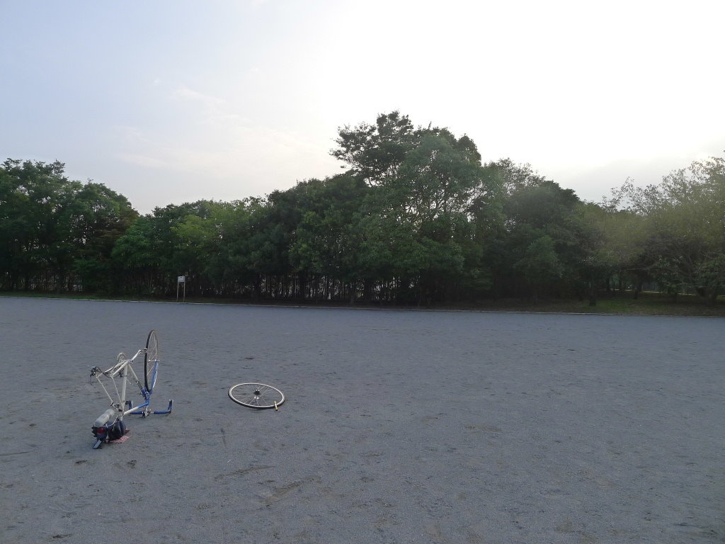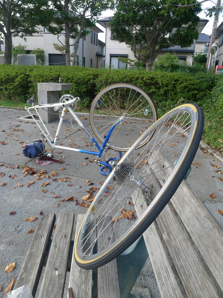 近くに公園があると押し歩いていたら広めの公園を発見しました。ベンチに座って余裕の修理!なんて上の写真を撮っていたら、突然災難がやって来ました。