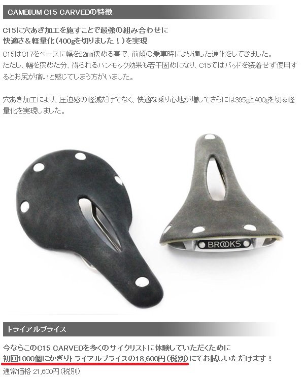 最早アナトミック系じゃないと無理かも(つÅ`;)とか悩みましたが、乗って馴れてしまえばナンノソノ。ただ BROOKS の場合はあの大きさが気になりましたが、C15 は若干小振りのようですね。このサイズが出ると分ってたら、待った可能性は高いです。