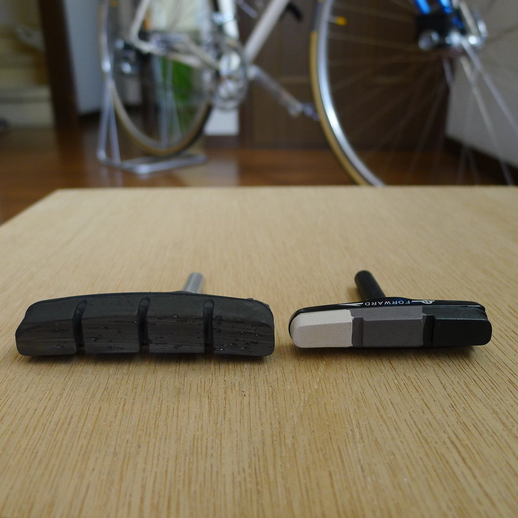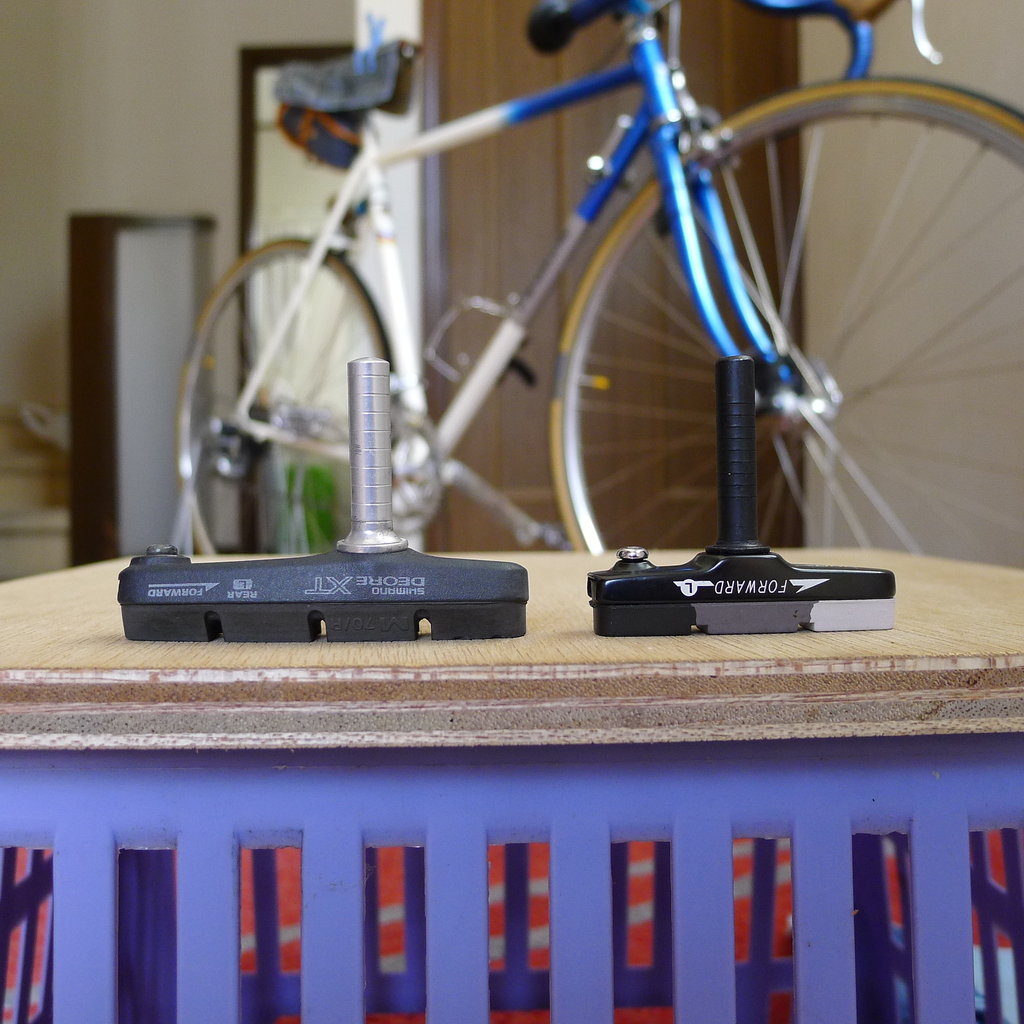 ケルビムから外したカンチブレーキセットだったシュー(約70mm長)を小さいこの三色アイスブレーキシュー(約55mm長)に交換します。