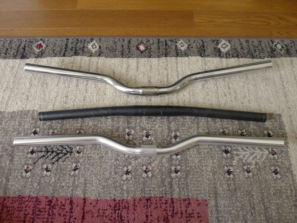 上>オリジナルのLEADTEC 鉄バー580mm 中>12年前交換したBAZOOKA ストレート アルミハンドルバー(B-004)ブラック515mm 下>NITTO B245 アルミバー545mm