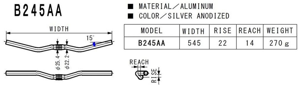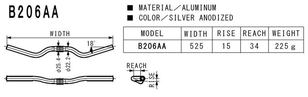 定番のB206と比べると幅+20mm ライズ+7mm リーチ▲20mm 重さ+65g 決め手はより自然な手首の絞り具合かな?