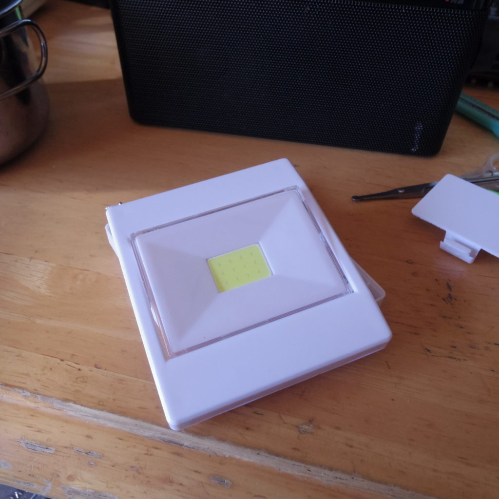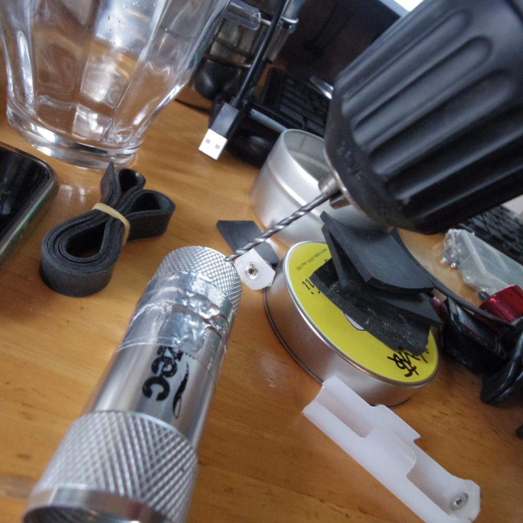 とりあえず何か代替え電池ボックスを作ろうと 故障中のいただきものLEDライトを切断したり穴を開けたり改造し ・・zec?
