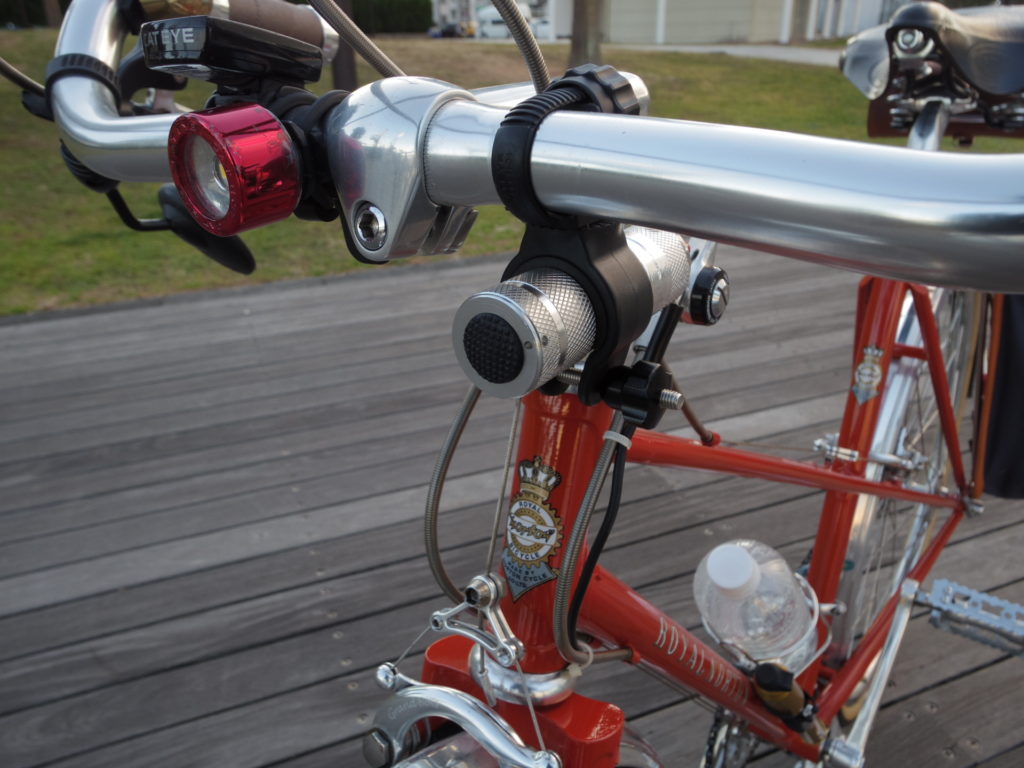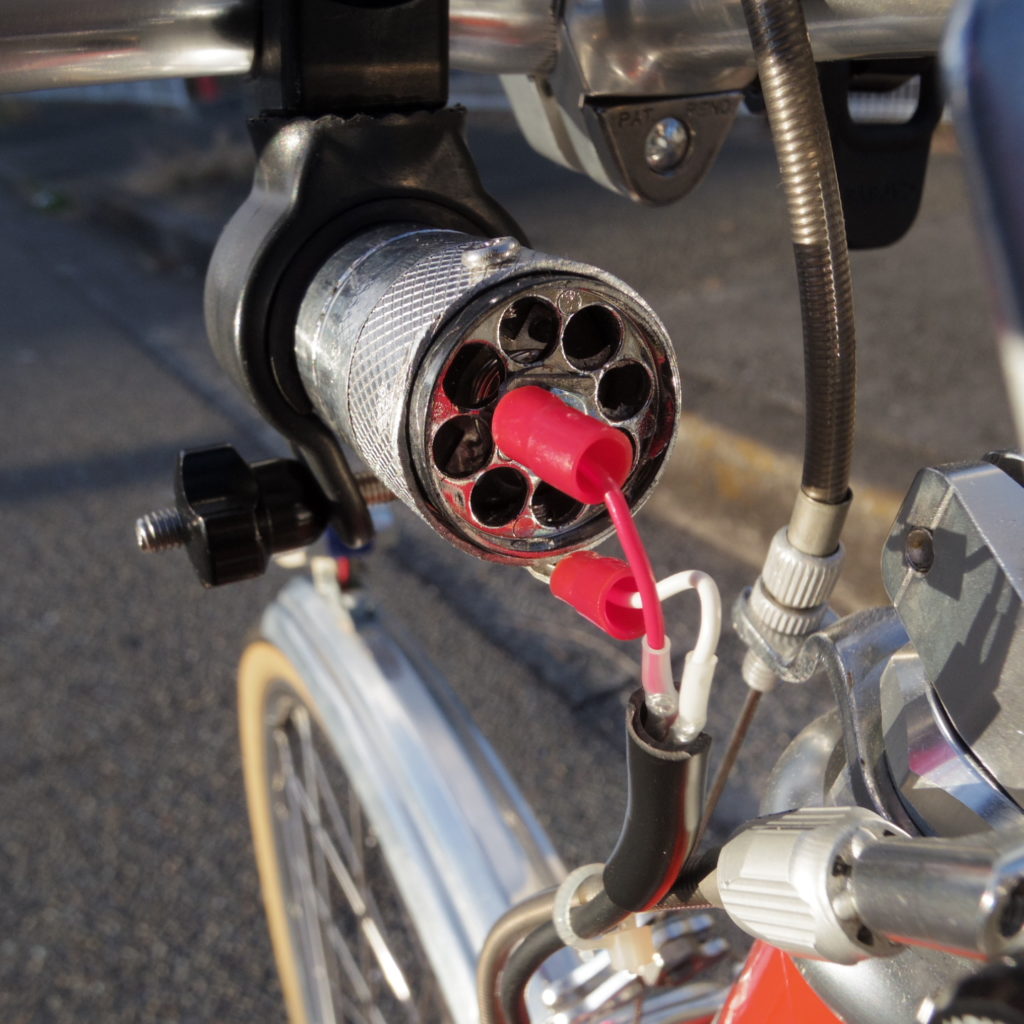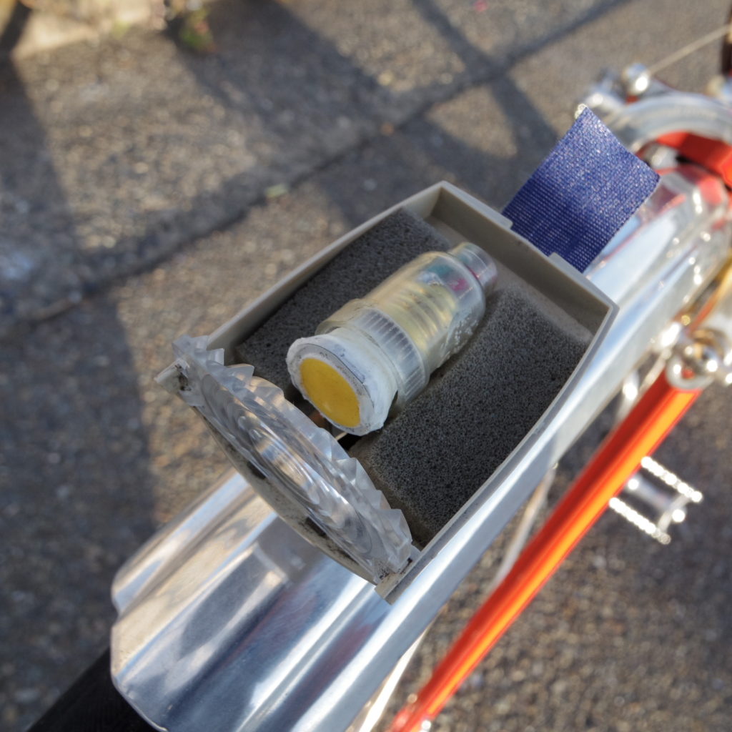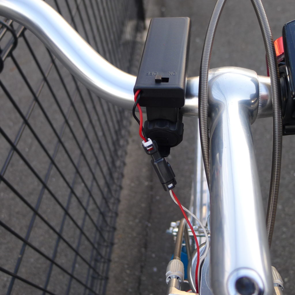 4電池3本の電池BOXをハンドルマウント 大黒丸がスイッチボタン 要するに懐中電灯のサカサマ付け爆