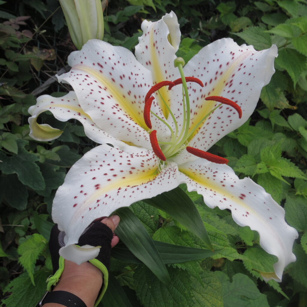 ここのヤマユリは花が重すぎて下を向いていました 花を持ち上げ写真を撮ったのですが強い香りにもクラクラしました