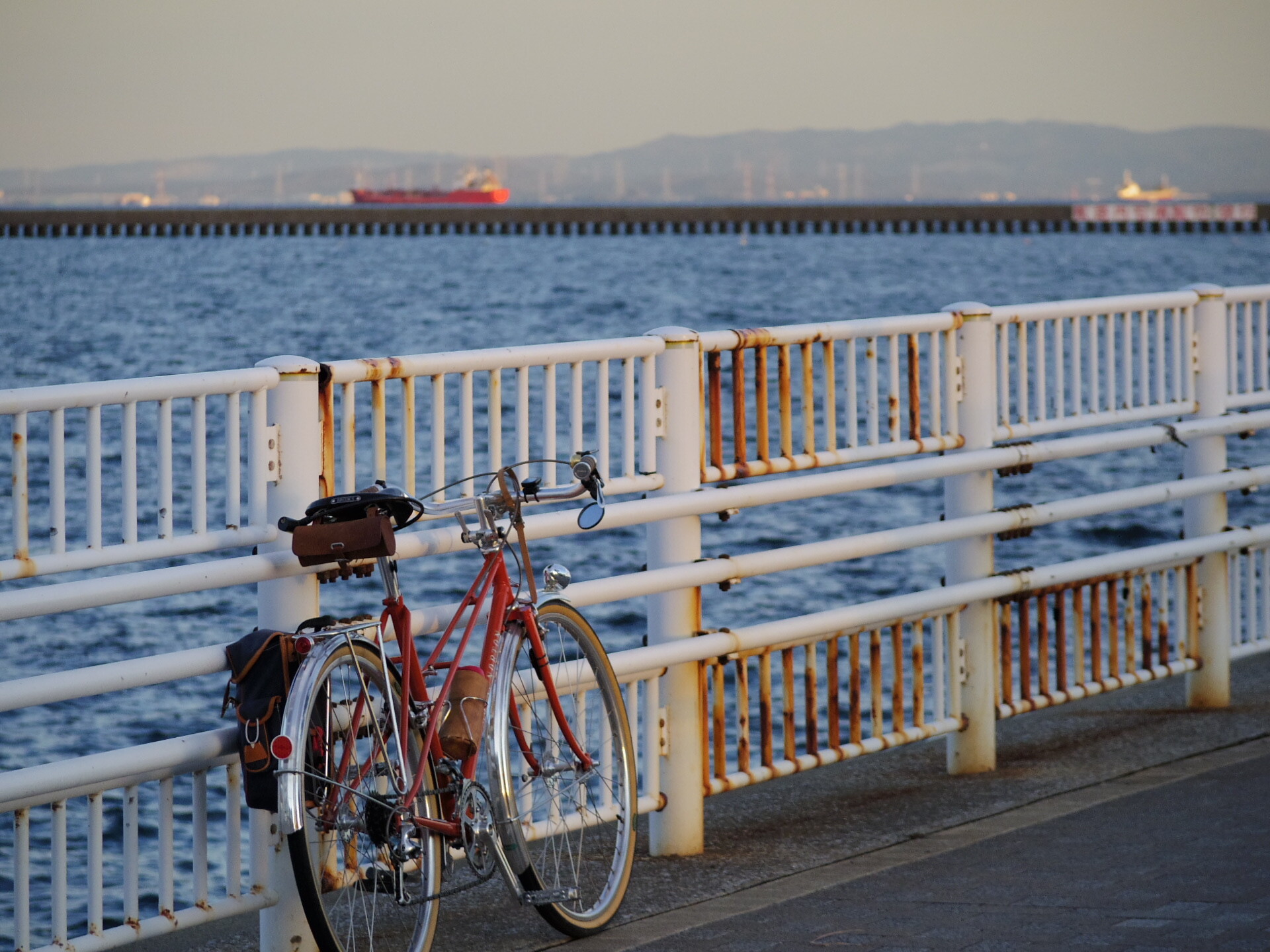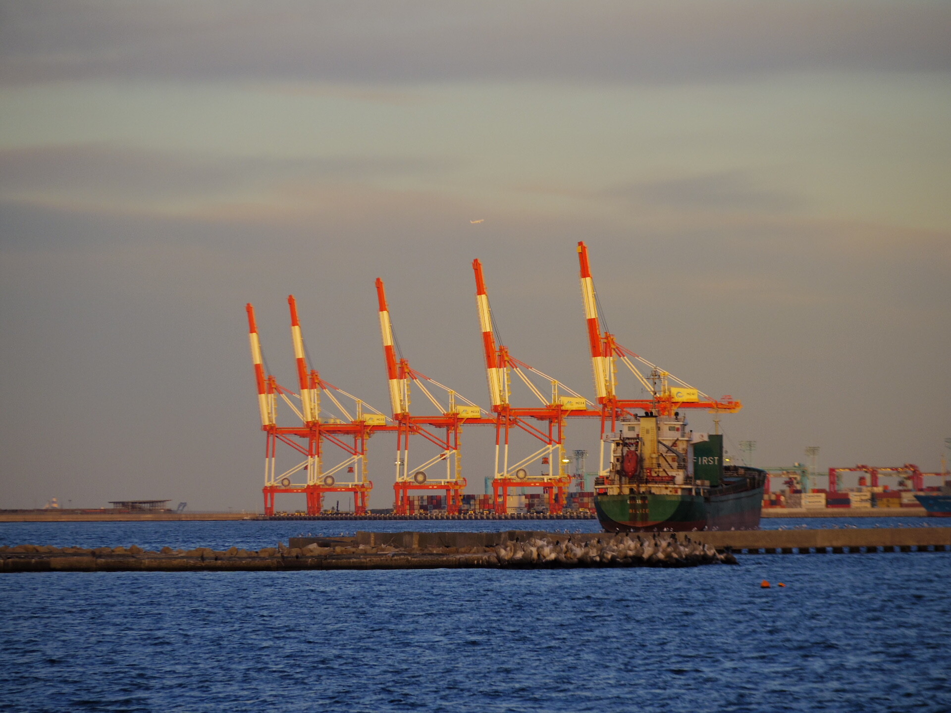 横浜港のキリンが夕日に染まります