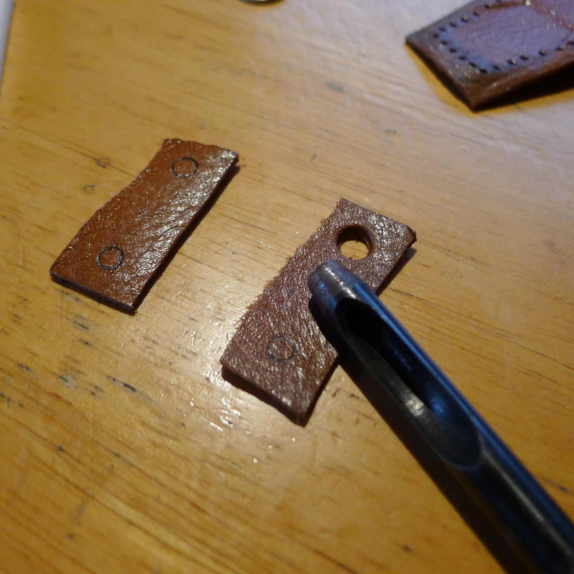 奥様にいただいたブーツの革はもったいないので以前使っていたビジネスバッグの革を使います ここでも大きさの目安はテントのコードスライダーです 穴の位置も丁度良いいのであります