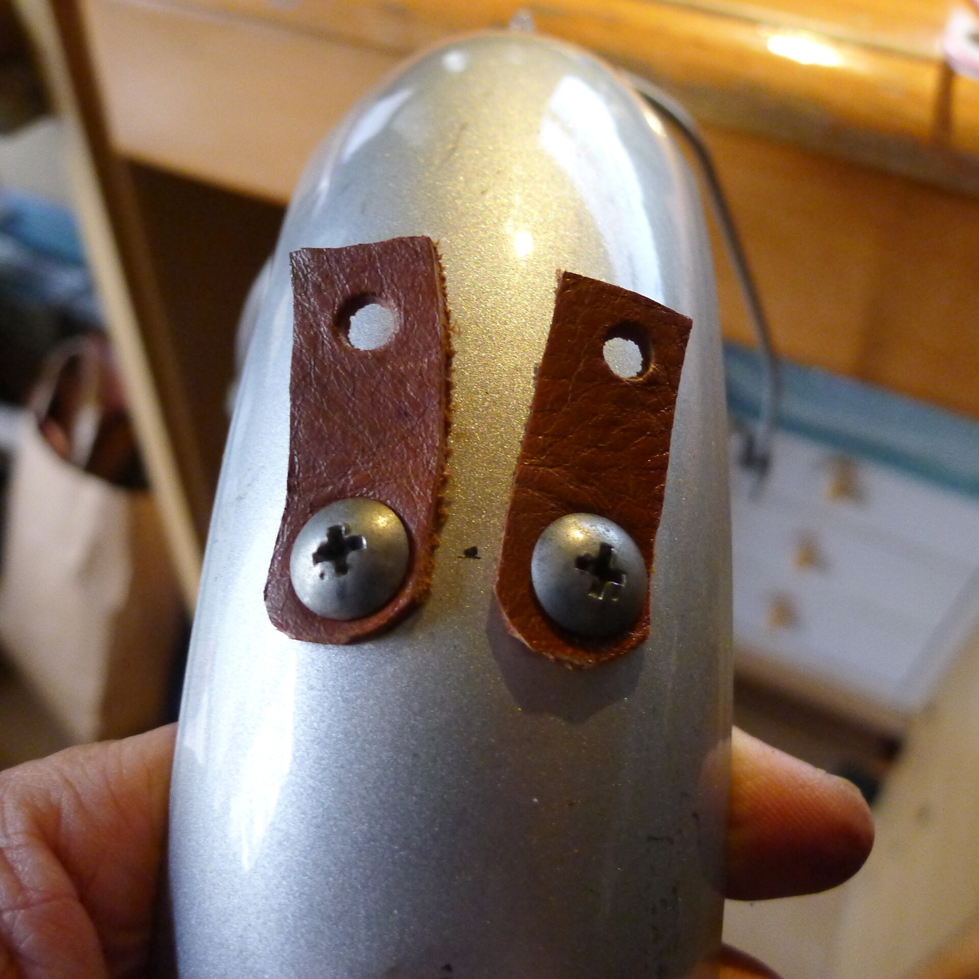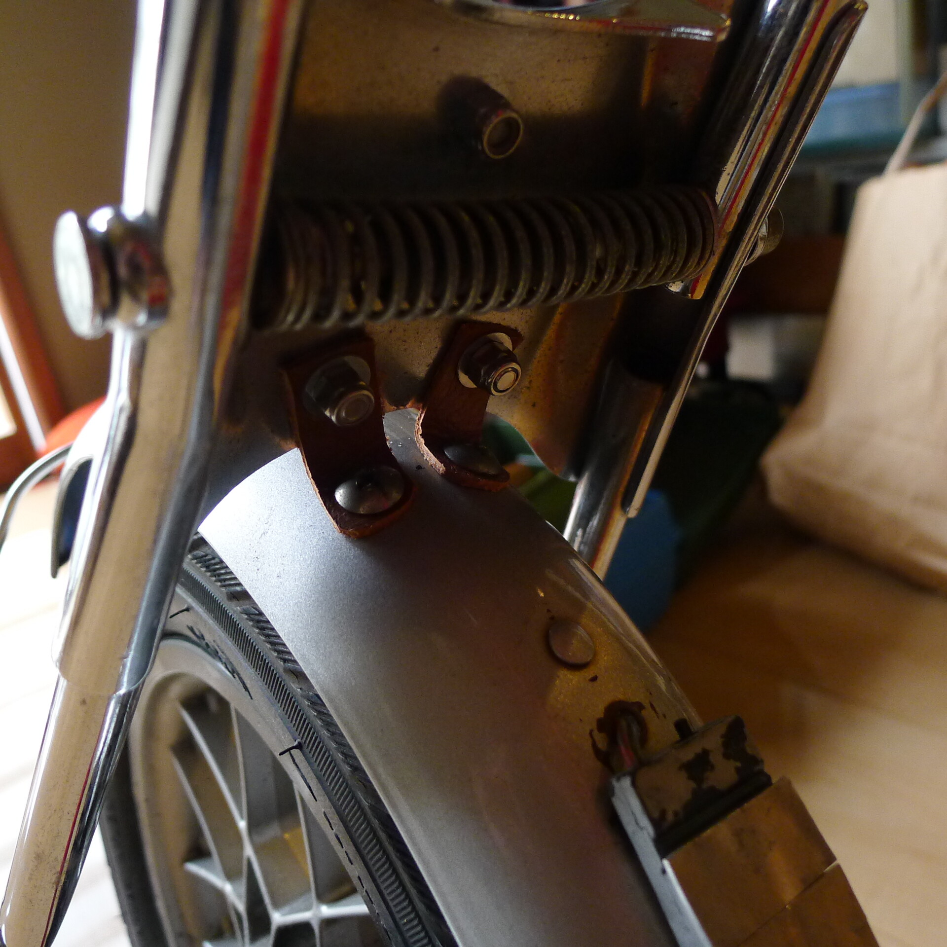 ワンピク泥除け金具、アルミがもげて、ゴムももげて、革に行きつきましたね。三度目の正直となるか、二度あることは三度あるか。家族計画はゴムがだいじですが、生身の皮同士の感触も良いですよね (^^;